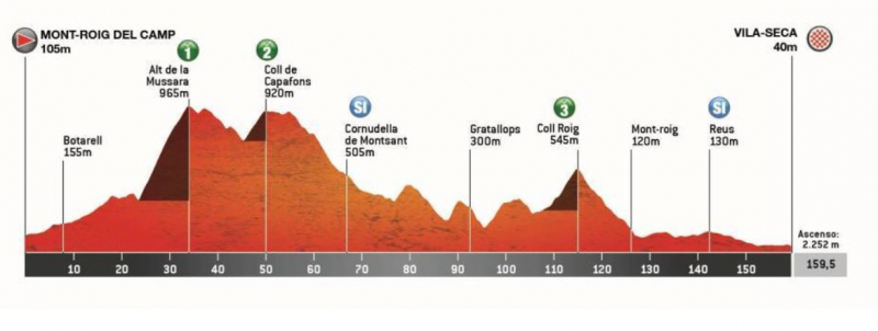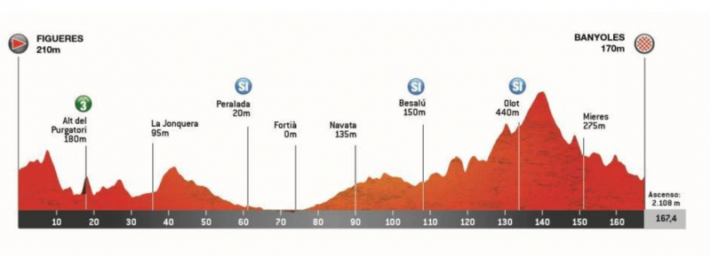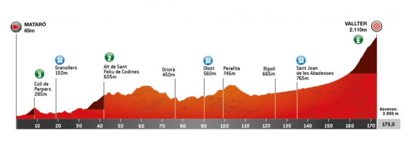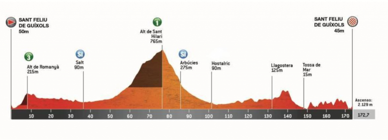 Гонщики начинают подниматься почти сразу, преодолевая Коль-де-Парперс — подъем протяженностью 3 км с 5%, затем следует Альт-де-Сан-Фелиу-де-Кодинес, который бросает вызов 9,8 км с 4%. После этого на десятки километров категорийных подъёмов нет, но дорога будет постоянно идти вверх-вниз, а финальные 60 км – только вверх.